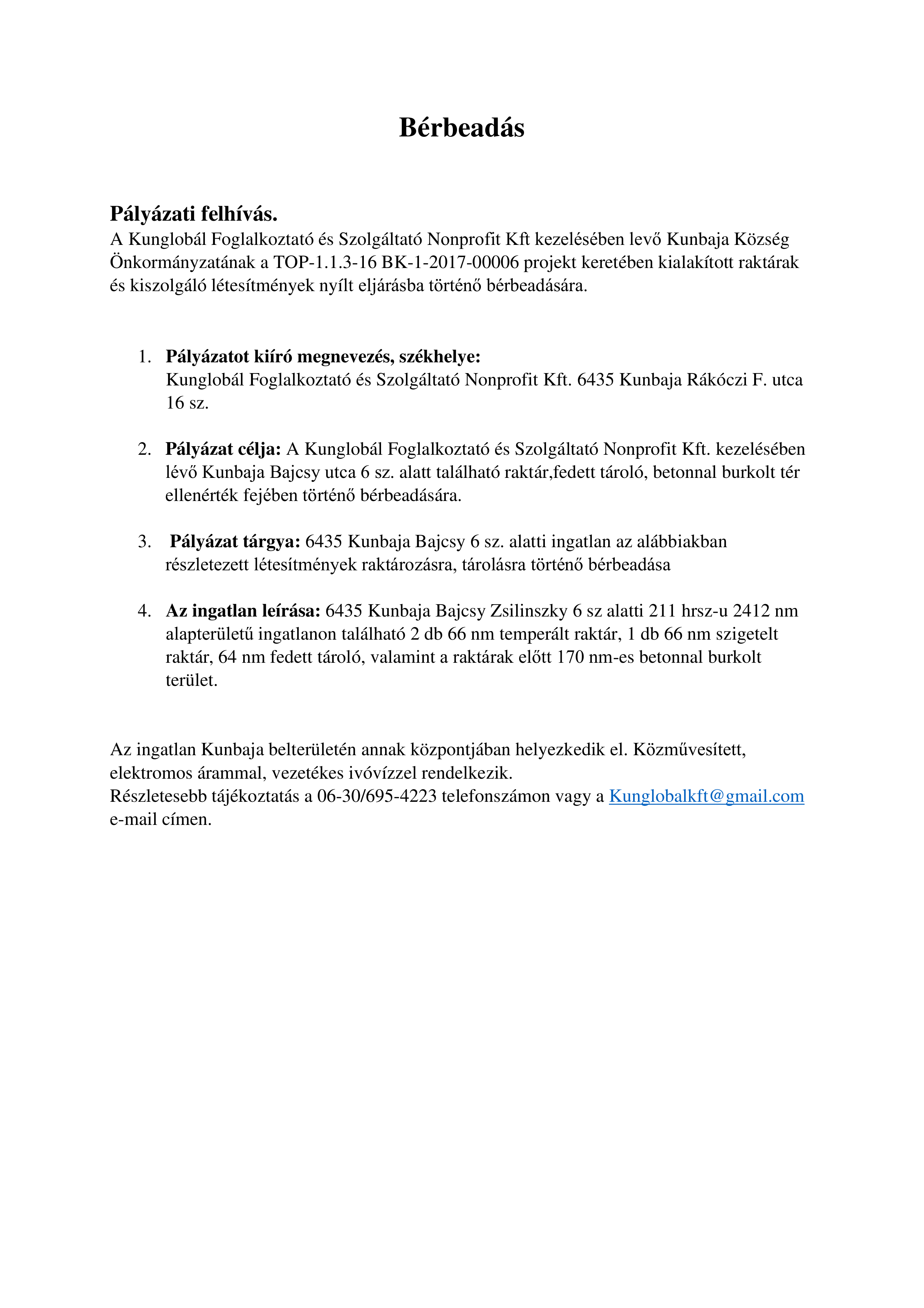 A Kunglobál Nonprofit Kft.-t a Kunglobál Foglalkoztató és Szolgáltató Közhasznú Nonprofit Kft.-t Kunbaja Község Önkormányzata